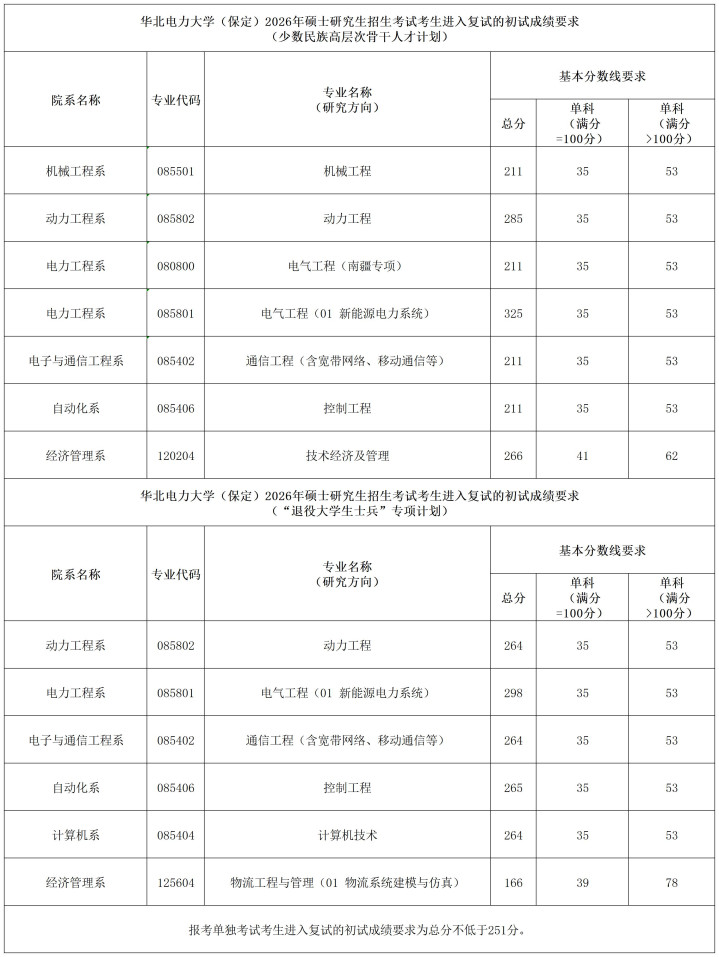 华北电力 大学(保定)2026年硕士接洽生招生测验考生参预复试的初试得益条目(非全日制专科学位)
