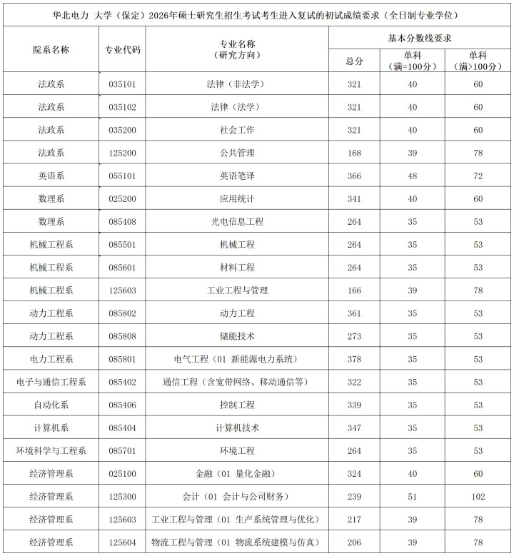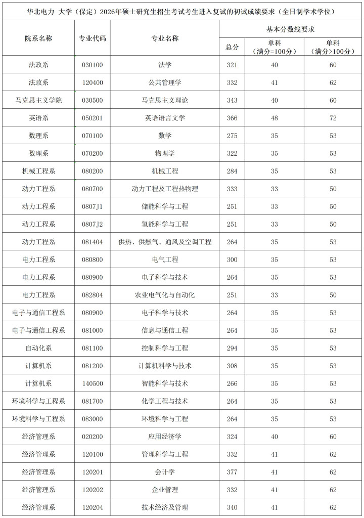 华北电力 大学(保定)2026年硕士接洽生招生测验考生参预复试的初试得益条目(全日制学术学位)