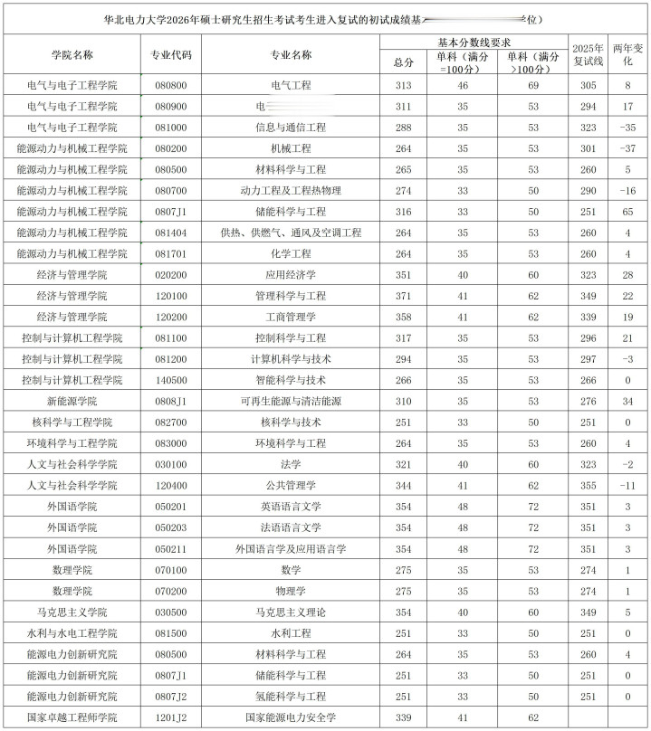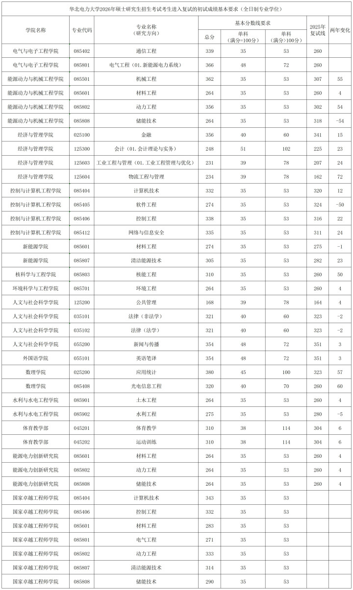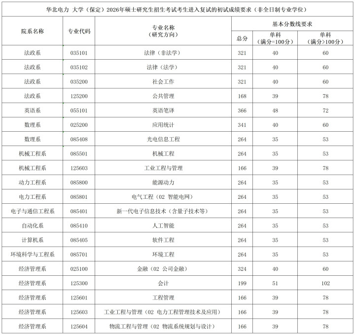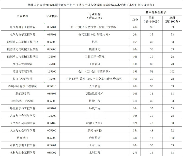 华北电力大学2026年硕士接洽生招生测验考生参预复试的初试得益基本条目(非全日制专科学位)