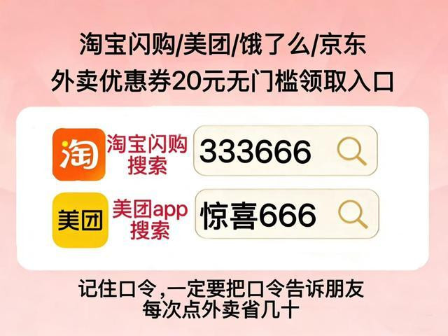-淘宝闪购:淘宝闪购搜[333666]领外卖无门槛大额券;淘宝闪购搜[333555]领外卖通用重叠券;淘宝闪购搜[333777]领外卖平日通用满减券;淘宝闪购搜[0600]领外卖终端福利券;淘宝闪购搜[0700]领新东说念主专属外卖券;淘宝闪购搜[0300]领外卖高面额扩张券。