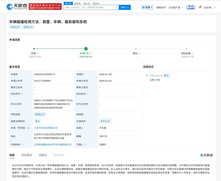 最近,小米汽车的一项新专利进入了公众视线,国度学问产权局的信息涌现,小米汽车科技有限公司肯求的“车辆碰撞检测圭臬、安装、车辆、做事器和系统”专利还是负责公布,这份专利文献自己是技能性的,但其中蕴含的念念路,却指向了一个更根底的问题:当一辆车发生碰撞后,何如才智最快地启动支柱,最大驱散地保险东谈主的安全?