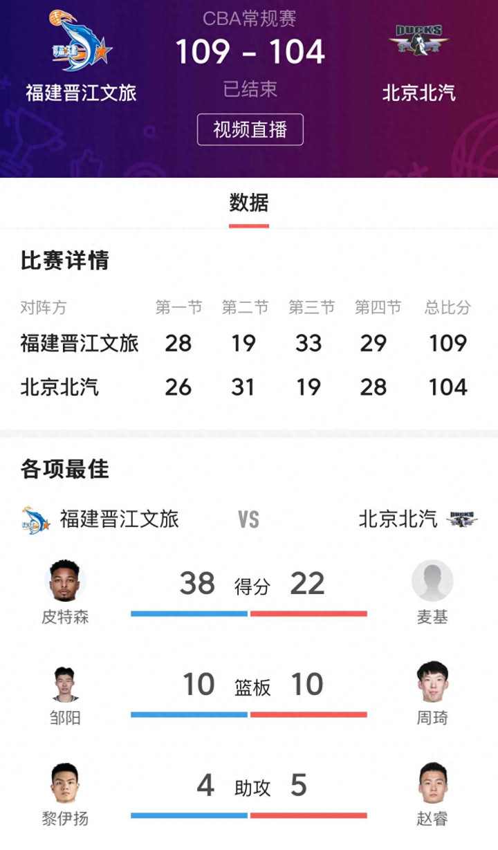 赛前北京获得一波4连胜,而福建也获得2连胜,两队情状王人相等好,但从实力来看北京威望更胜一筹,被以为最有可能在客场带走见效,同期在积分榜上也重回四强。