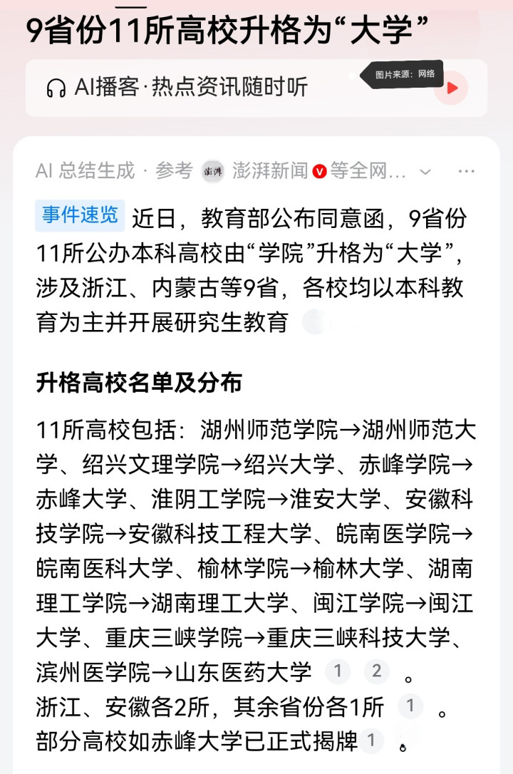 近日,教师部认真发布批复,天下9个省份的11所公办本科高校,得手由“学院”改名为“大学”。这次升级笼罩浙江、内蒙古、安徽等多地,其中浙江、安徽各2所,其余省份各1所。湖州师范学院改名湖州师范大学、绍兴文理学院改名绍兴大学,赤峰学院改名赤峰大学等,多所院校已完成认真揭牌。这些高校均以本科教师为中枢,同期具备参餬口培养天禀,这次改名是经由严格审核、各项办学办法全面达标后的官方认定。