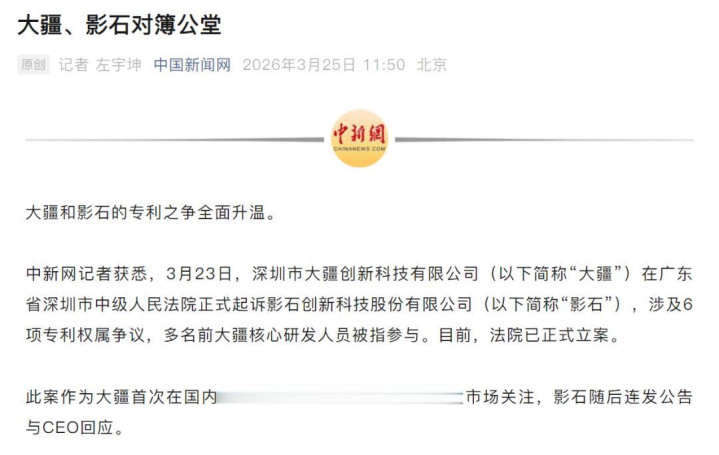 3月23日,大疆向深圳市中级东说念主民法院拿告状讼,指控影石及6名前大疆中枢研发东说念主员,波及6项专利权属纠纷。随后,影石首创东说念主刘靖康、市场负责东说念主袁跃接踵公开修起,直指大疆多款居品落入影石专利保护范围,两边争端从司法层面马上升级为公开博弈。