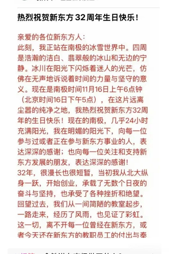 新东方独创东谈主俞敏洪在新东方开导三十二周年顾忌日,他在南极的旅行途中,靠近宽敞广大的雪白白雪,行走在南极这个世界的一个顶点。俞敏洪厚谊鲁莽,壮志满怀,想起三十二年新东方的风风雨雨,文念念泉涌,写下了绝代外传,名传千古的《强烈祝愿新东方三十二生辰欣慰》的著述,哄骗自如千八百字,字字珠玑,句句诛心,谈话丽都, 文华高涨,关爱奔放。从新东方创业劳苦,风风雨雨到小有建树;从商海千里浮到空前绝后,寰宇时髦。有心酸眼泪,也有得胜应允,有别有精心着的报复,也有同业者的同仇敌慨,展现新东方好意思好异日更是感情万丈,必将登上世界南极同样的顶峰。