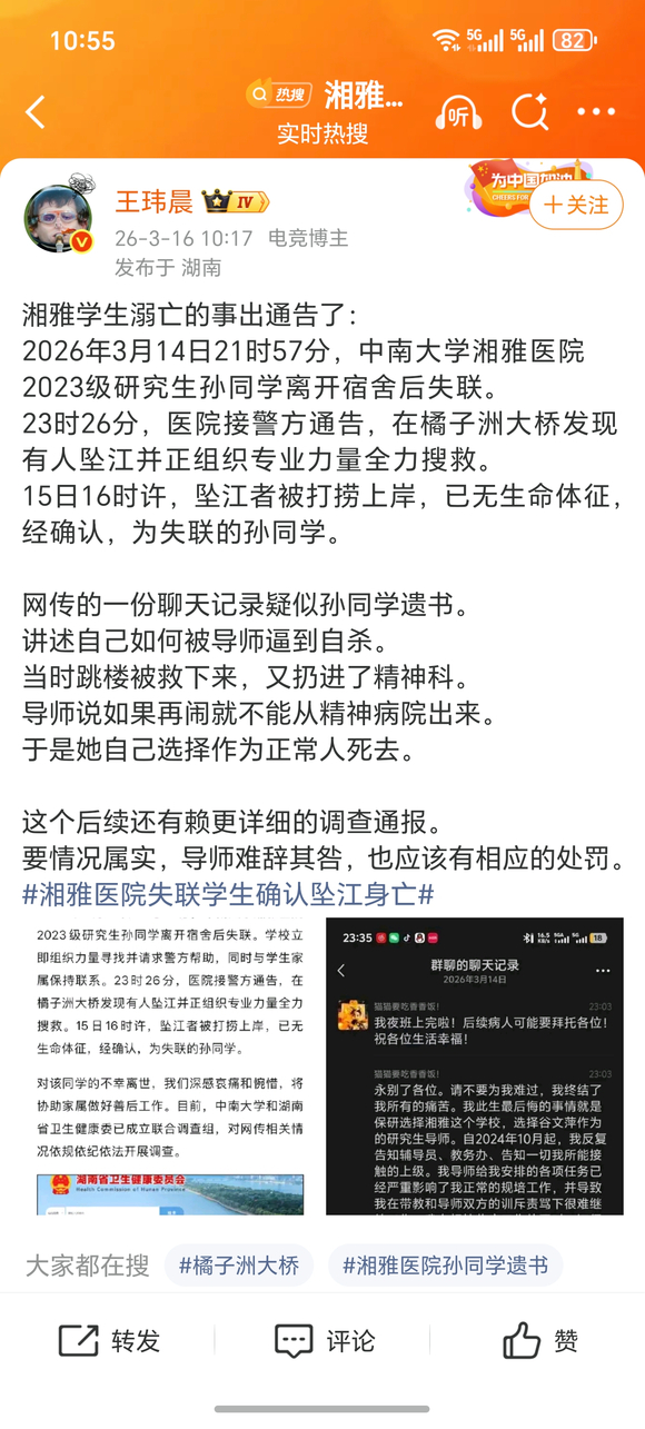 要是只把“中南大学湘雅病院谷某某课题组孙同学坠江身一火”当成一个孤单的悲催去看,咱们可能只会获得两种情愫:一种是大怒和质疑,一种是哀叹和愁然。