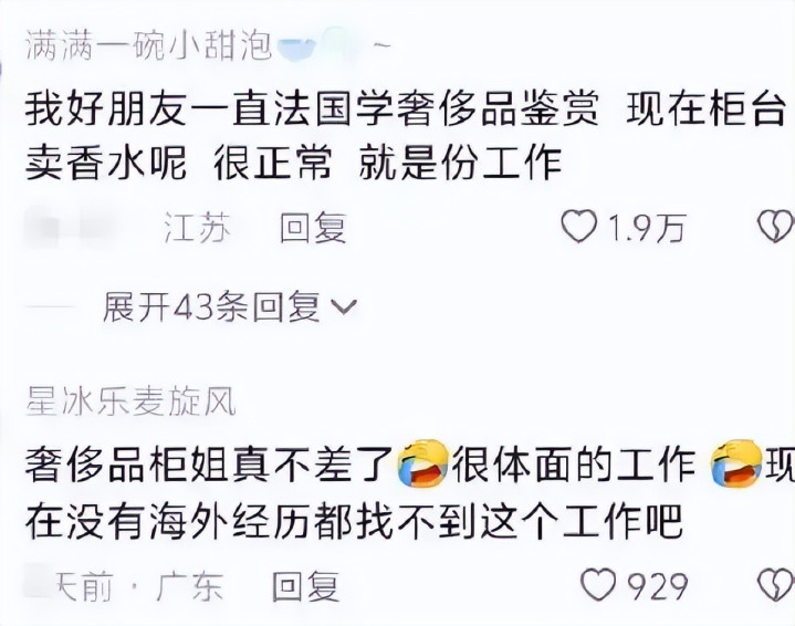 而糜费店的使命,除了条件英语好,在一线城市,会法语和意大利语无疑是加分项,是以,女子当初的这段留学经历,为她换来了这份还算体面的使命。