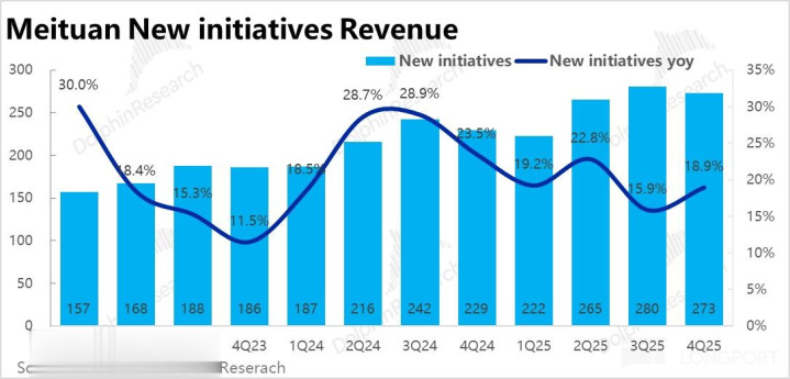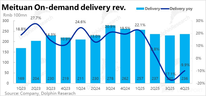 和到家业务(即外卖 + 闪购)强绑定的配送性收入本季同比下滑幅度从上季的 17% 收窄到约 10%,如上季提过的,这主如果好意思团给骑手的补贴会记为收入减项的原因。连结市集预期的即配单量增速,隐含单笔配送收入同比减少幅度从上季的约 40% 收窄到了约 30%(仅供参考)。