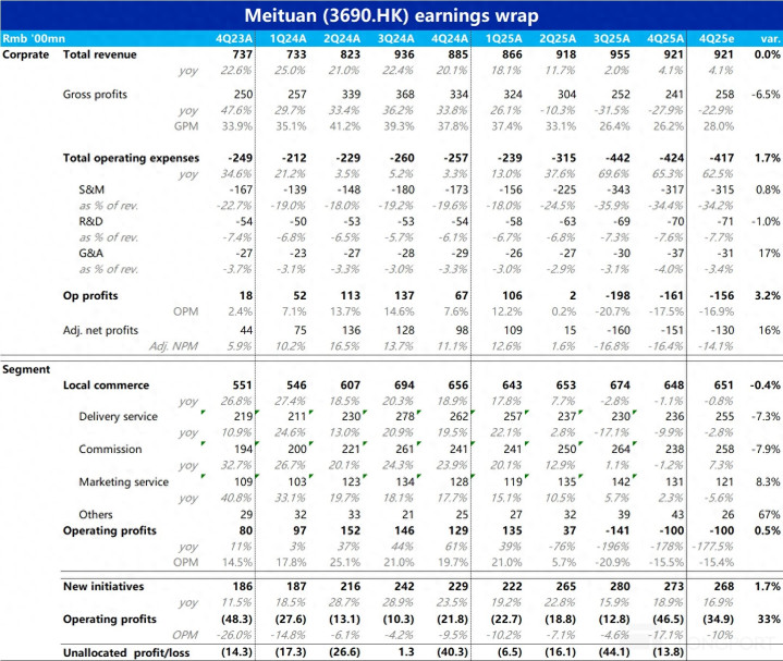 3 月 26 日港股盘后,恒科 “外卖指数” 中临了一个首要玩家—$好意思团-W(03690.HK) 也发布了 25 年临了一季度财报。由于公司此前已发布盈利预警,中枢土产货买卖板块和集团合座失掉王人是明牌,试验弘扬和预警基本一致。但仔细来看真实利润如故有些不足预期的,因新业务失掉显然扩大,把中枢土产货买卖减亏出的钱又大部分再亏了出去,具体来看: