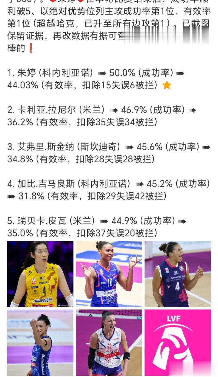 25-26赛季意大利A1联赛半决赛首回合一齐罢了后,主攻位置按遑急告成率名次(扣球次数多于300)。朱婷在本轮比赛罢了后,告成率到手破5、以十足上风位列主攻告成率第1位、有适度第1位(越过哈克,已升至扫数边攻第1)。