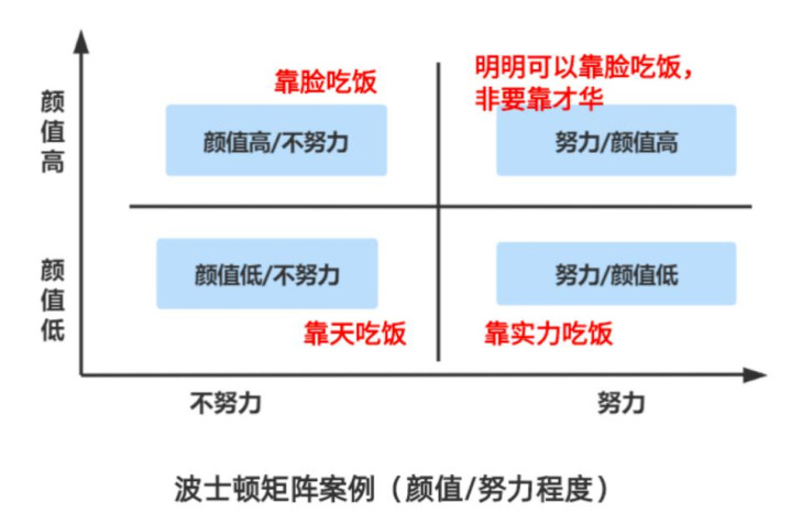 接下来最出彩的场合来了,他让我们用“颜值”和“是否戮力”算作两个分析维度,将东说念主分红四类,并给他们打上标签。他举了一个例子“颜值高/不戮力”等于靠脸吃饭,剩下三类是什么呢?