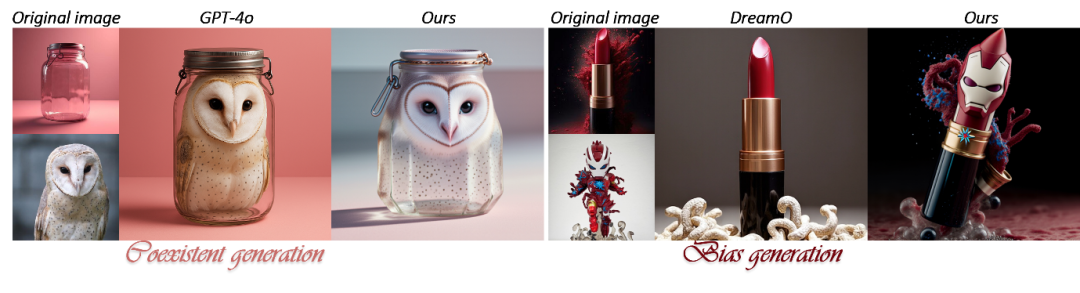 这恰是跨物体交融生成恒久存在的两个中枢难题: 一类叫coexistent generation,也即是「共存但不交融」;另一类叫bias generation,也即是「只偏向一边,另一边被吞掉」。