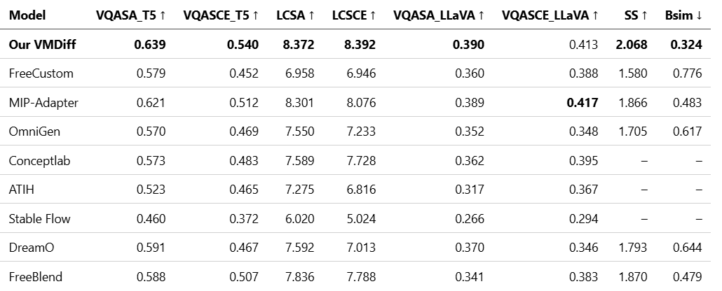 VMDiff 确凿挑升义的场地,不仅仅作念出了几张顺眼的图,而是它给「跨物体视觉交融」这件事提供了一种很光显的要害论: