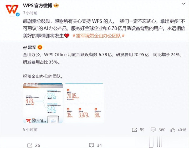PChome 3月26日音书,本日,小米集团独创东谈主雷军在微博发文,透露了金山办公的两项优异收获并致以道喜。金山办公随后转发其微博并表态将抓续深耕AI办公规模,为世界用户提供更好的工作。