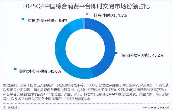 前不久,易不雅分析发布的即时零卖阛阓阐明夸耀,2025年第四季度淘宝闪购即时交游阛阓份额为45.2%,好意思团为45.0%,两者份额差距仅0.2个百分点。