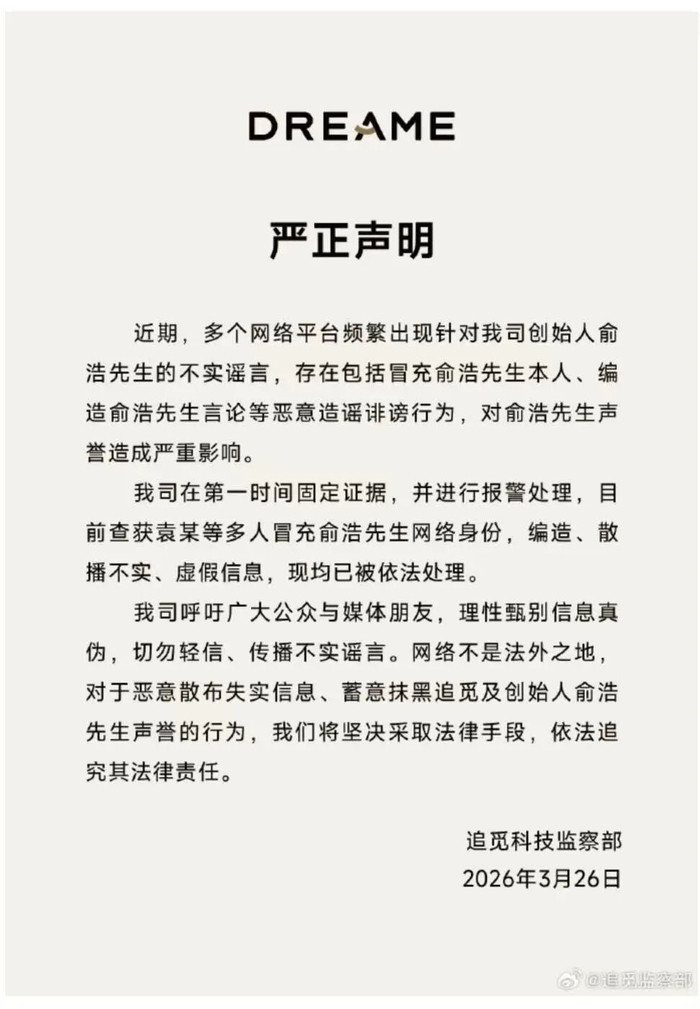 3月26日,追觅科技监察部发布声明称:近期,多个相聚平台经常出现针对我司首创东谈主俞浩先生的不实坏话,我司在第一时期固定把柄,并进行报警经管,当今查获袁某等多东谈主冒充俞浩先生相聚身份,虚构、区分不实、装假信息,现均已被照章经管。