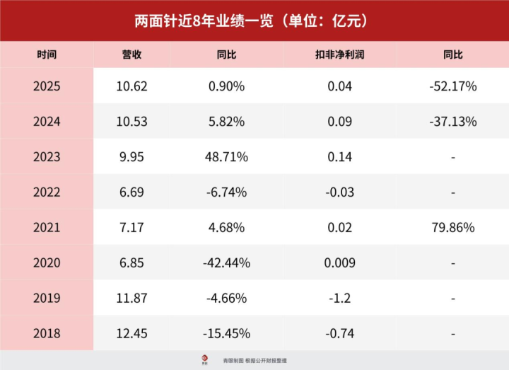 青眼通过梳理两面针公司2018—2025年近八年财务数据发现,其营收不仅未能终了增长,反而举座下滑且波动剧烈。2018年公司营收为12.45亿元,到2025年回落至10.62亿元,八年间不升反降。时间,2020年营收一度“腰斩”至6.85亿元,同比下滑42.44%;尽管2023年曾出现48.71%的短期反弹,但随后增速速即回落至个位数,增长辛勤握续性,方向基本面永远未能雄厚。