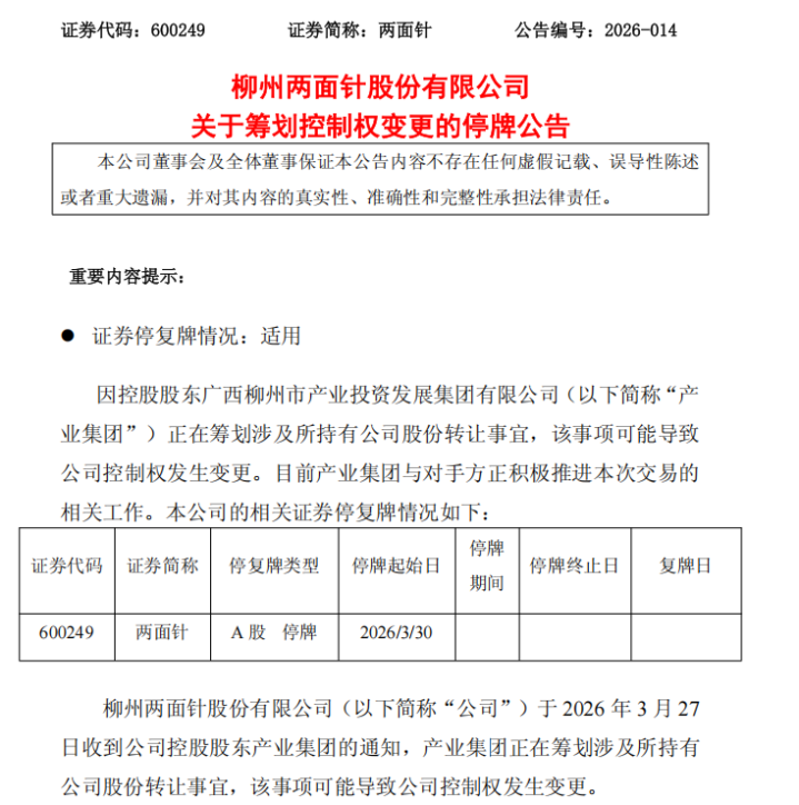 3月27日,两面针公司发布公告称,公司收到控股鼓励柳州产投集团奉告,其正权谋所握公司股份转让有关事宜,该事项可能导致公司限度权发生变更。公告同期暴露,鉴于控股鼓励权谋股份转让事项,公司股票将于3月30日起停牌,预测停牌时间不进步2个交游日。