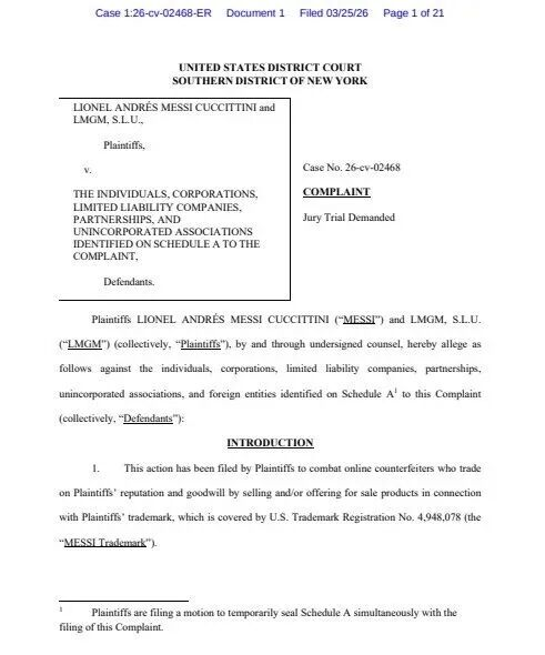 但是,告状状表示,多名中国卖家未赢得梅西方面的任何授权,私行盗用“MESSI”字母、图形商标及个东谈主姓名权益,大规师法制并售卖默契服、鞋类、箱包、配饰等侵权商品。这些假冒伪劣商品借跨境渠谈涌入好意思国市集。